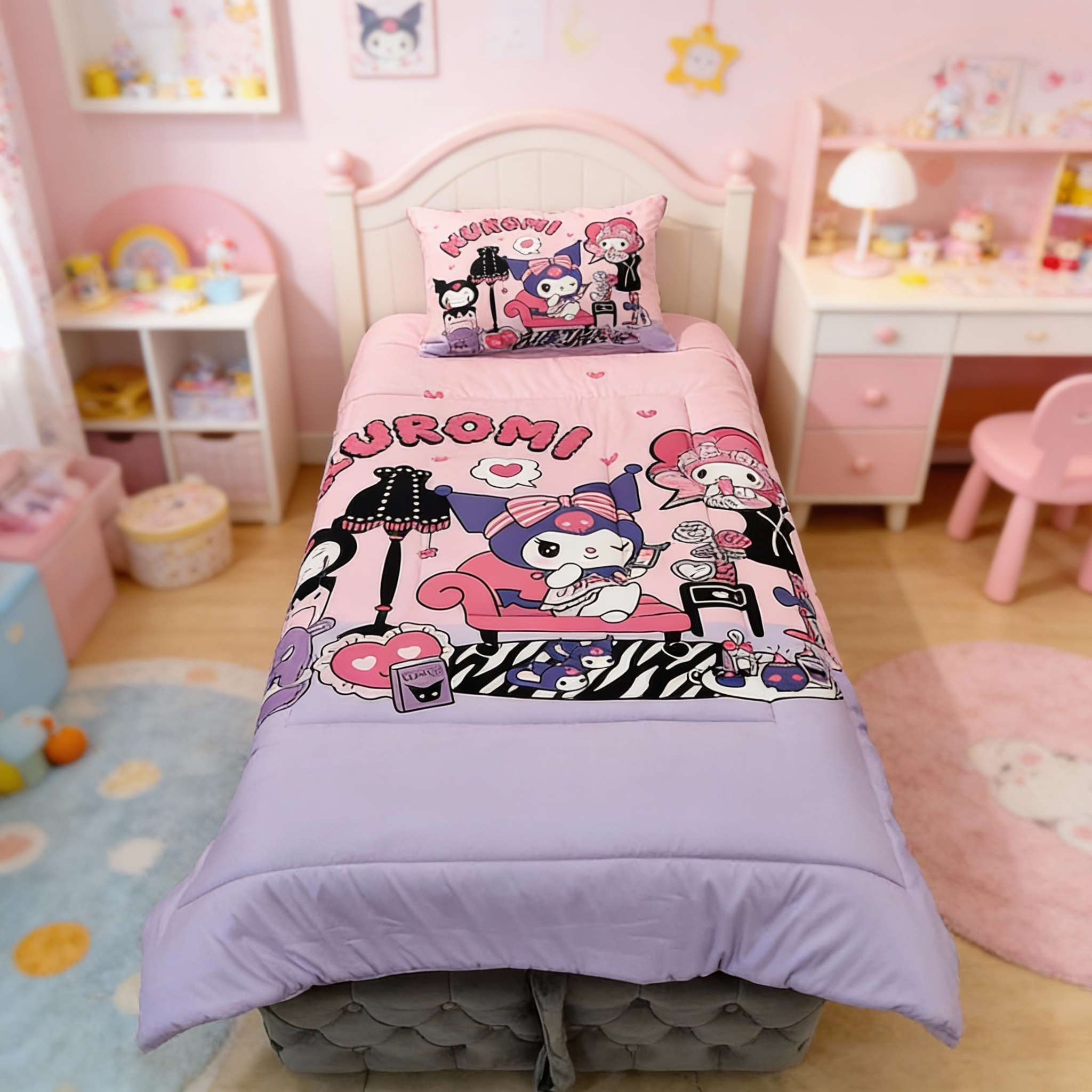 اگر به دنبال روتختی‌ای خاص، فانتزی و پر از حس لطافت برای اتاق خواب دخترانه‌تان هستید، روتختی کو‌رومی لاولی اسلیپ بهترین انتخاب است. این مدل با طرح کارتونی محبوب Kuromi و رنگ‌های ملایم صورتی و بنفش، جلوه‌ای دل‌انگیز و انرژی‌بخش به دکور اتاق می‌بخشد.