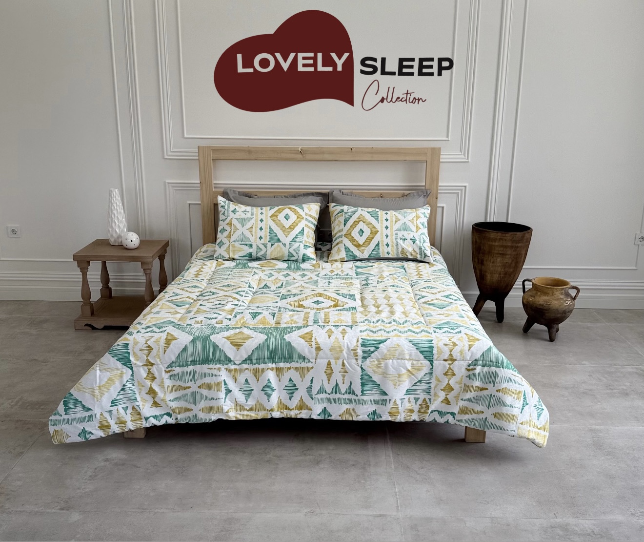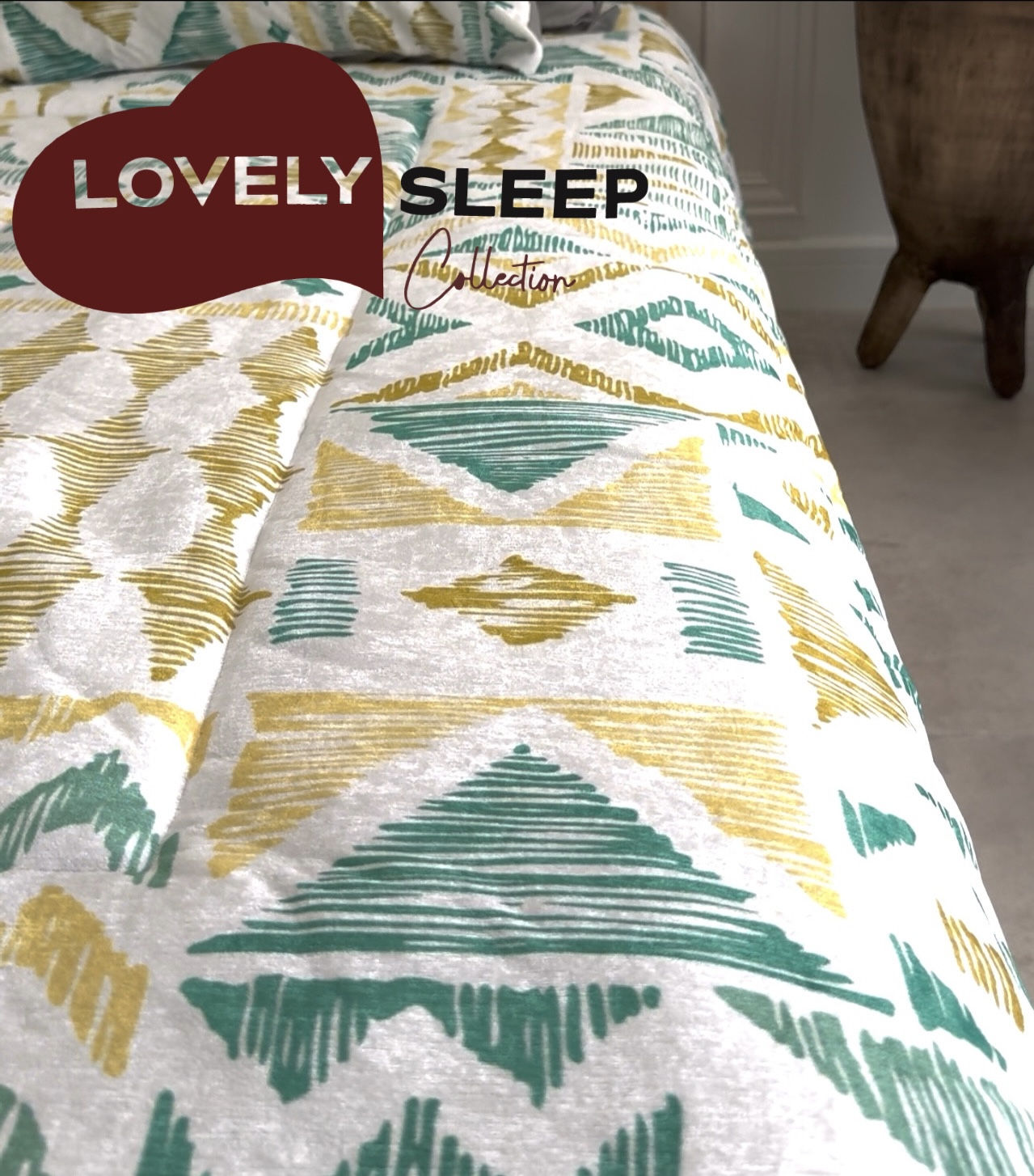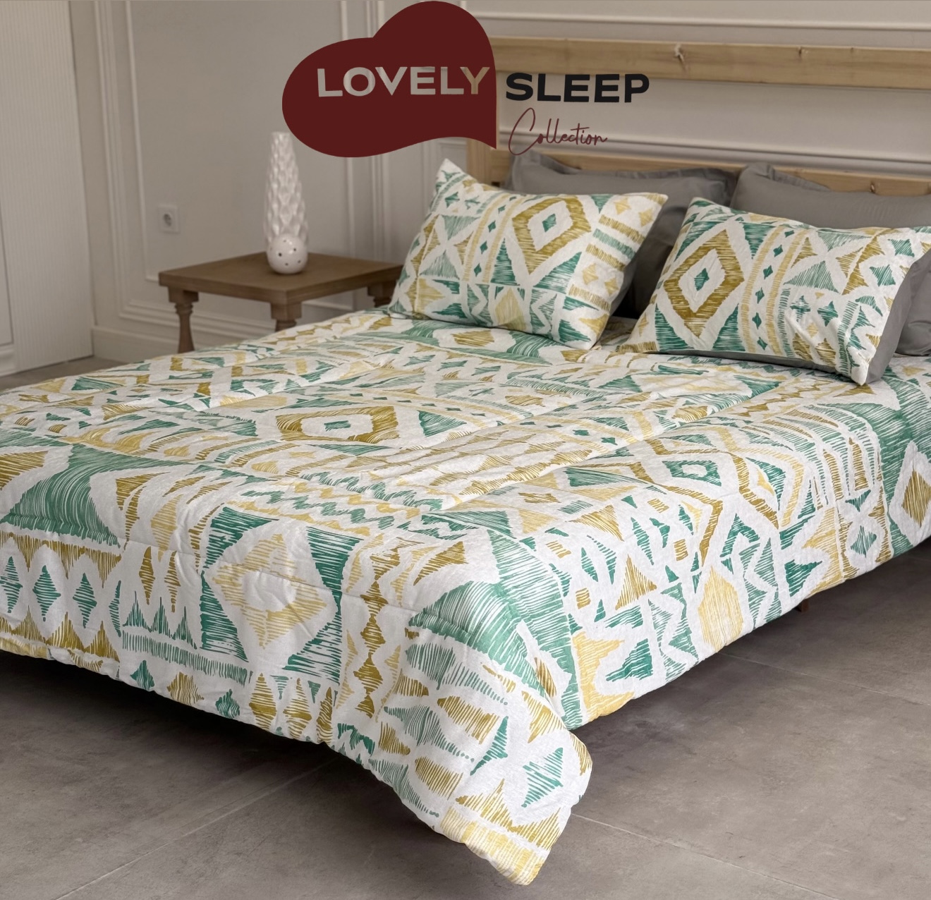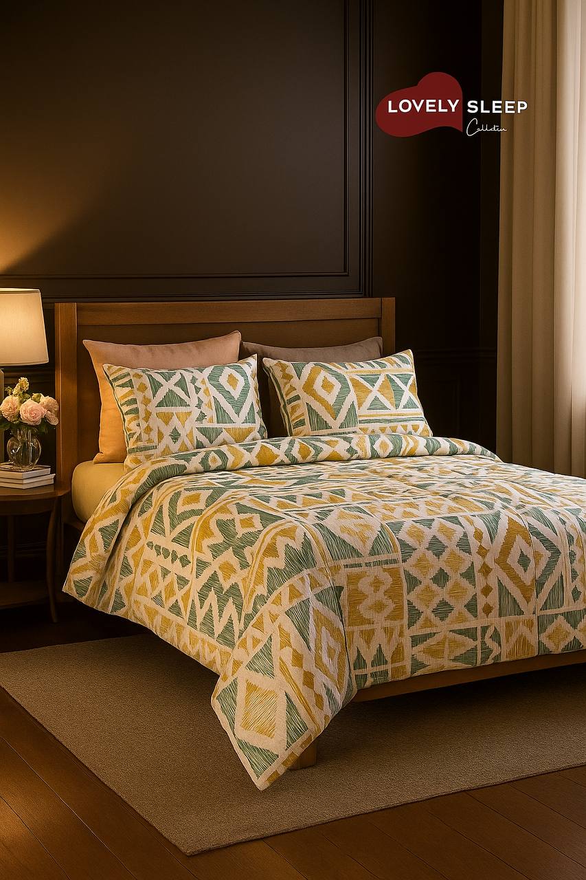 الگوی هندسی در رنگ‌های سبز زیتونی، سفید و طلایی الهام‌گرفته از زمین و عناصر طبیعی است؛ طرحی مرتب، متعادل و در عین حال گرم و دل‌نشین که فضای خواب را به آرامش و نظم دعوت می‌کند.