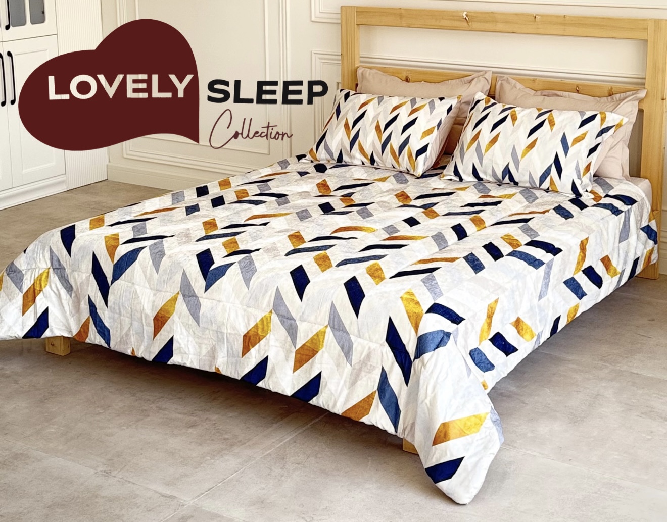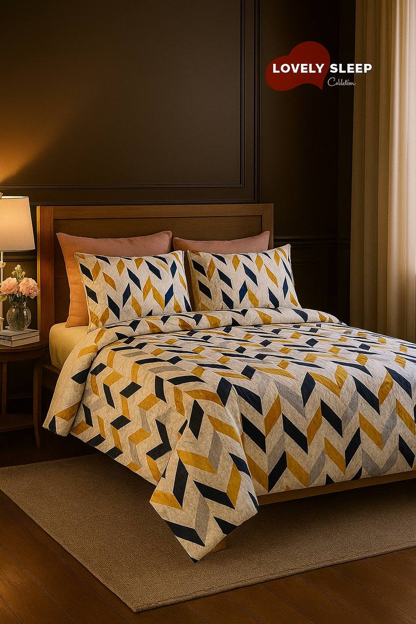 روتختی مخمل لاولی اسلیپ مدل نوا انتخابی ممتاز برای دکوراسیون مدرن و مینیمال است. طرح هندسی منظم آن با ترکیب رنگ‌های طلایی، سرمه‌ای و خاکستری جلوه‌ای از نظم، ظرافت و درخشش مینیمال را در اتاق خواب شما خلق می‌کند.