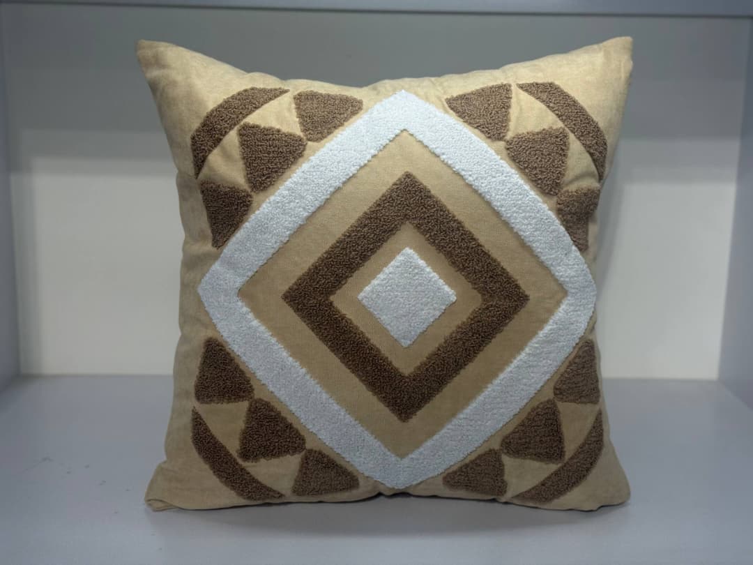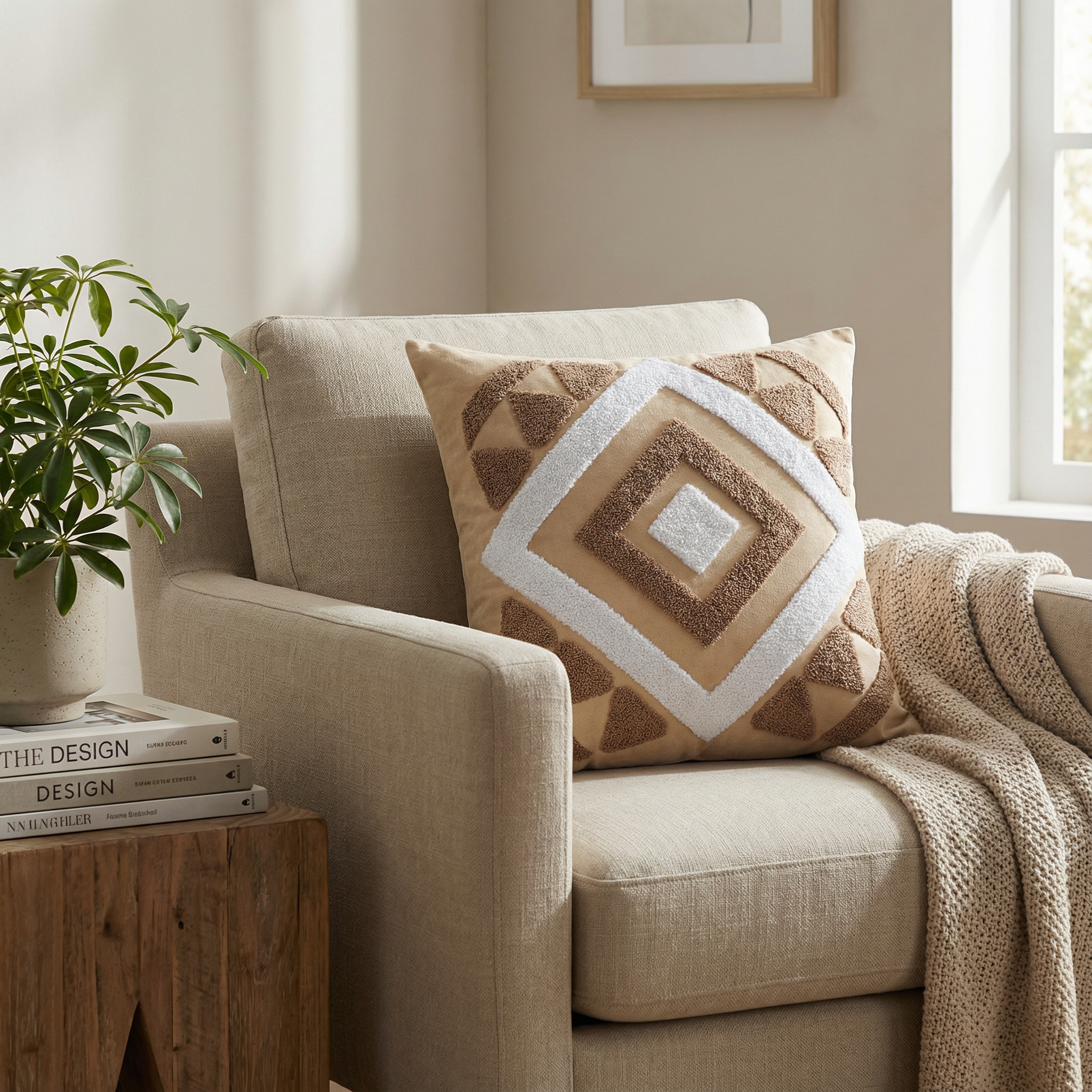 کوسن گلدوزی طرح لوزی هندسی، یکی از محصولات مینیمال و الهام‌گرفته از الگوهای مدرن هوم‌تاش است که با بافت برجسته متداخل، سادگی و عمق بصری تازه‌ای به فضای نشیمن‌تان می‌آورد. ترکیب رنگ‌های بژ/کرم خنثی برای زمینه، قهوه‌ای متوسط تا تیره برای لوزی میانی و طرح‌های محیطی (مثلثی و قوسی)، و سفید خالص برای لوزی‌های داخلی و بیرونی، ظاهری آرام و طبیعی ایجاد می‌کند — ایده‌آل برای دکوراسیونی که می‌خواهد حس هندسی و خنثی رو با بافت نرم ترکیب کنه.